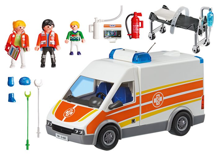 Esta ambulancia dispone de luces y sonido, además de contar con dos asistentes necesarios y una camilla de ambulancia. El techo se puede quitar y la puerta lateral se desliza para facilitar el juego.