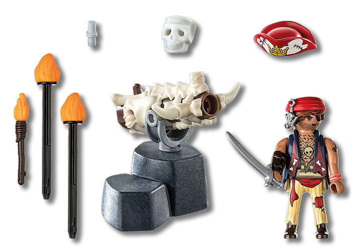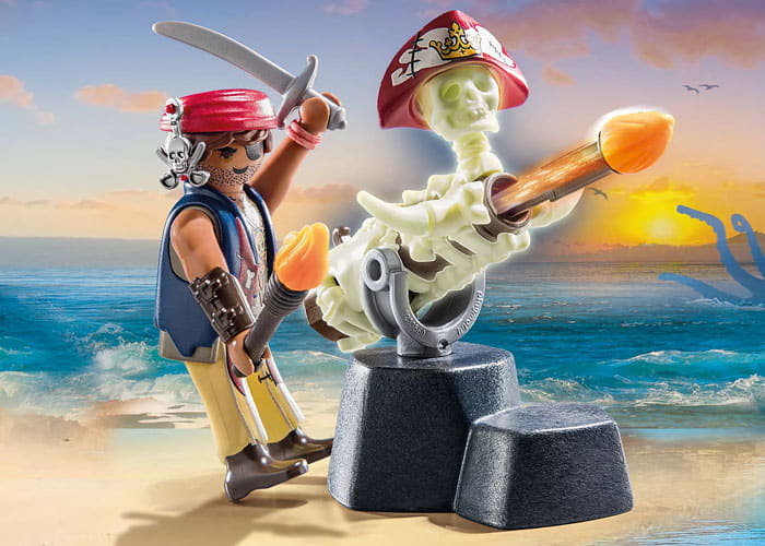 El cañón pirata, que gira y se mueve de lado a lado, está listo para disparar y nunca falla a su objetivo. Incluye elementos que brillan en la oscuridad.