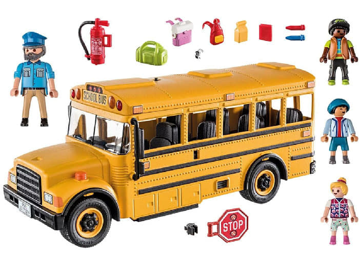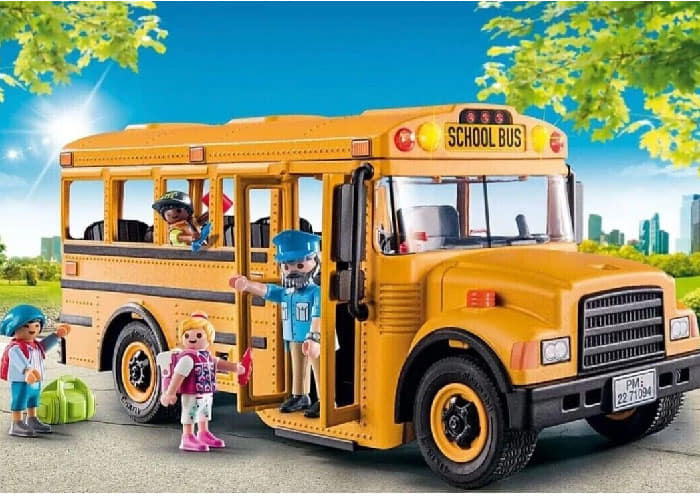 ¡Qué divertido es ir al cole con el autobús escolar! Incluye 4 figuras. Con luces (2×1,5 V AAA) Pilas no incluidas.