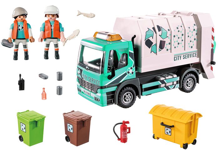 Con luces y sonido (pilas incluidas), techo desmontable y palanca para levantar y vaciar los contenedores. La parte trasera del vehículo se puede inclinar y vaciar. Dimensiones: 30 x 13 x 18 cm (LxDxH)