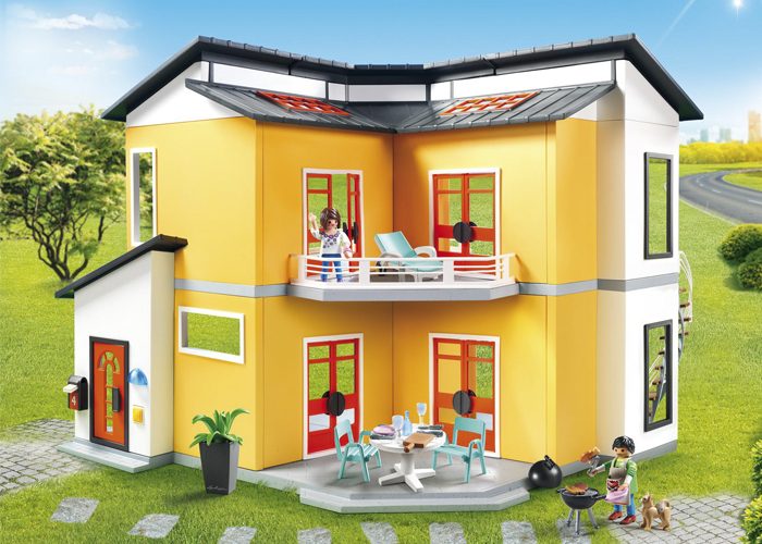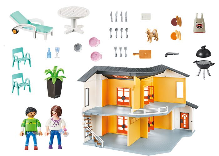 Playmobil 9266 Casa Moderna. Nueva casa moderna con cinco habitaciones. Con escalera, balcón y una bonita terraza con barbacoa. También tiene un timbre en la puerta y una iluminación muy funcional. Con muchos accesorios. Incluye 2 figuras.
