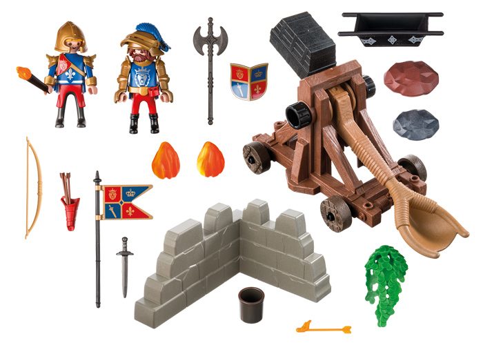 La catapulta ha sido transportada al campo de batalla con sus ruedas. Ahora los caballeros del León preparan piedras y objetos que sirvan de proyectil. ¡Lancen piedra!