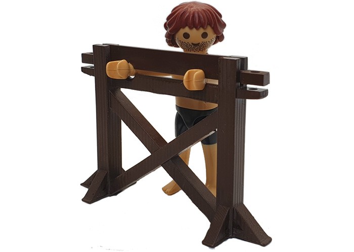 El cepo está realizado en impresión 3D, como pieza compatible con Playmobil y posteriormente pintado en color marrón.