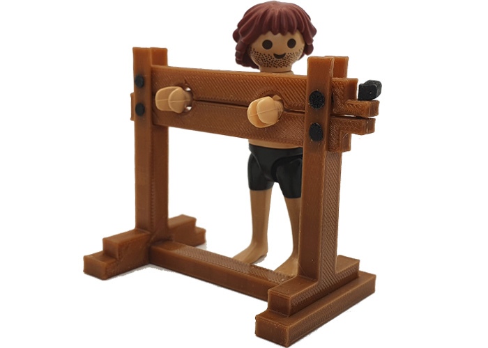 El cepo está realizado en impresión 3D, como pieza compatible con Playmobil y posteriormente pintado en color marrón.