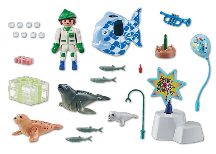 Creatividad, diversión y alegría con el Set de Regalo PLAYMOBIL Cuidador con animales. Este set viene ya empaquetado en una caja decorativa que incluso tiene espacio para el nombre del cumpleañero. Despídete de las molestias del envoltorio. Sumérgete en el mundo de los cumpleaños con las adorables focas, donde celebran su cumpleaños y su cuidadora va vestida de pez, equipada con una trompeta para hacer una gran entrada.