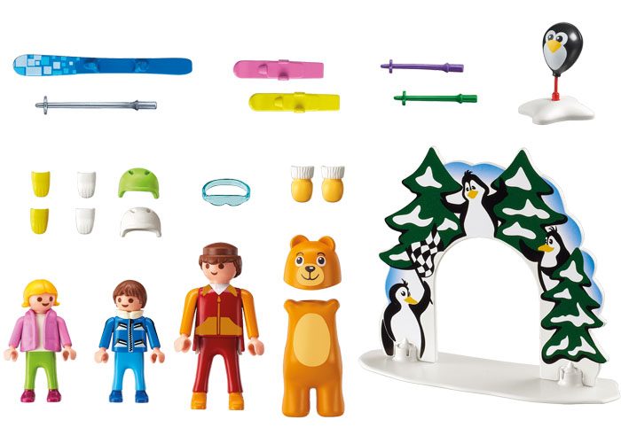 Familia aprendiendo a esquiar. Figuras incluidas: 1 hombre, 1 niño i 1 chica. Contiene también un disfraz de oso, dos esquís, bastones, guantes, cascos. El disfraz del oso es extraíble. Incluye también herramientas como arco y globos de pingüinos que sirven como palos de slalom.