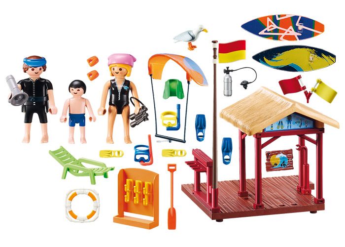 En la escuela de deportes acuáticos, el equipo puede ser prestado para muchos deportes acuáticos. Las banderas reemplazables indican la clasificación de peligro de las olas.