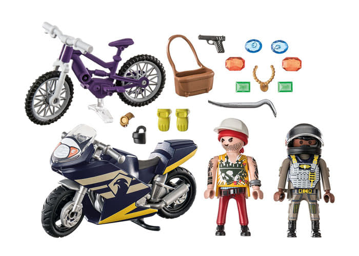 Atrapa al ladrón de joyas con el StarterPack Fuerzas Especiales y Ladrón de PLAYMOBIL. En su moto, el ladrón intenta escapar y poner a salvo las valiosas gemas. Pero el policía con alcanza rápidamente al villano. Un detallado set de juego a partir de 4 años. El set de juego incluye dos figuras PLAYMOBIL, una moto, un casco con visera, guantes, una bicicleta, joyas y otros extras.