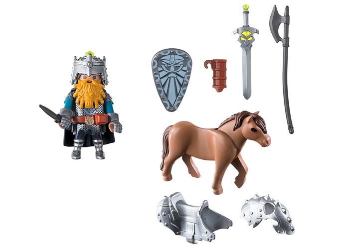 El General enano está preparado para ir a lucha junto a su rey, se dispone a cruzar el reino equipado con todas sus armas y montado en su pony con armadura.