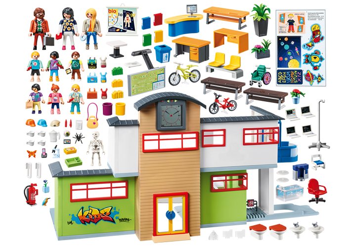 Gran edificio de escuela, con dos aulas, secretaria, escaleras con armarios integrados, elevador y baños. Dispone de reloj digital que también se puede usar como reloj de alarma (requiere 2 micro baterías de 1,5 V).