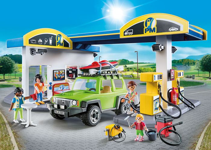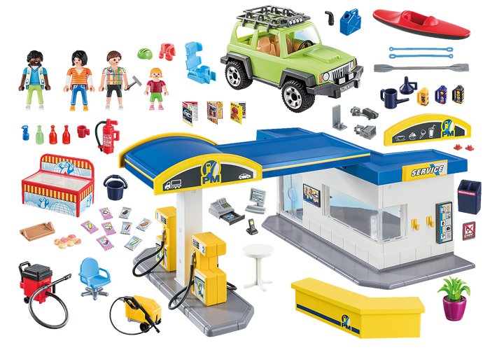 Para repostar autos y camiones. En la tienda tambien puede comprar accesorios para el automóvil y alimentos o snack para el viaje. Incluye vehículo todoterreno, kayak y muchos accesorios para el cuidado del vehículo. Se puede combinar con el garaje Referencia 70202.