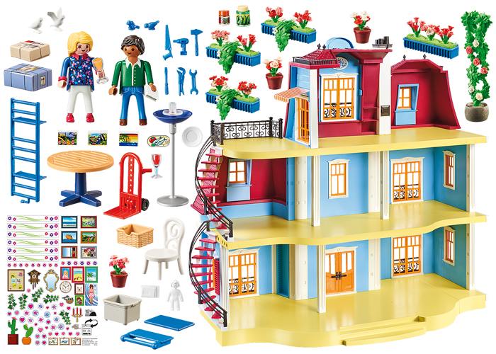 ¡Los Playmobil se mudan a la nueva casa! Con terraza, escaleras de caracol, timbre (se necesitan pilas para su funcionamiento) y buzón para las cartas. Perfecto para combinar con las seis acogedoras habitaciones y dejarlo completamente amueblado.