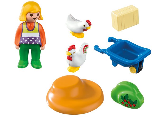 La granjera con carretilla se prepara para dar de comer a sus gallinas. ¡Un día magnífico en la granja!