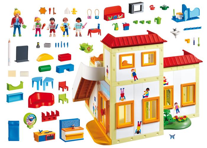 con cocina de juguete, piezas de construcción y un acogedor rincón, cocina y sanitario.