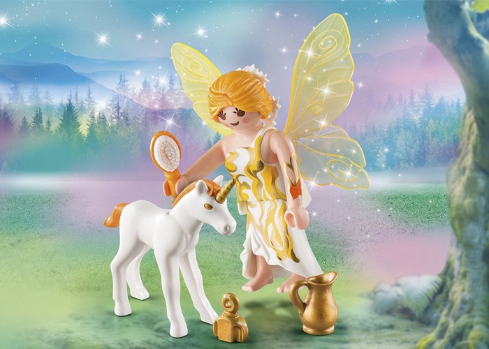Playmobil Hada del Sol con potro de unicornio. El hada se entretiene peinando el pelaje del lindo potro. Corresponde a la serie Special Plus.