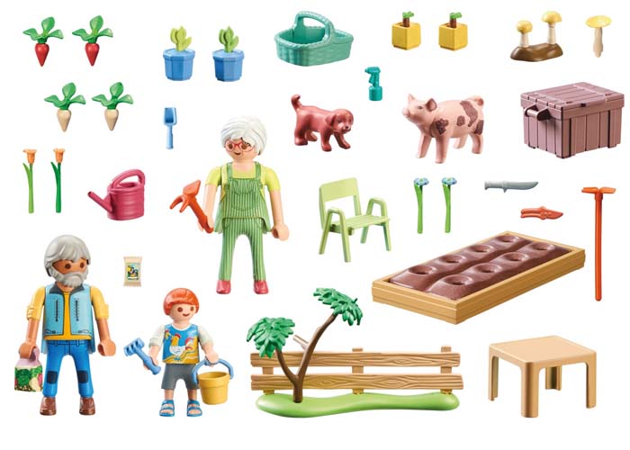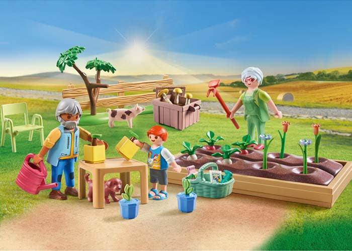 ¿Qué hay mejor que pasar unas vacaciones con los abuelos? Cuida del cerdito y aprende mucho sobre jardinería. La jardinera se puede llenar de agua el parterre para que las plantas "crezcan".