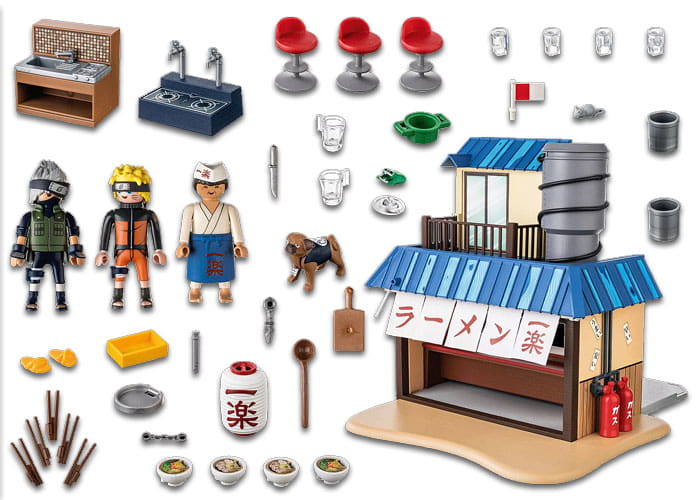 Bienvenido al restaurante de ramen Ichiraku, el lugar favorito de Naruto Uzumaki. Únete a Naruto y Kakashi y disfruta de una de las deliciosas sopas de ramen que el Chef Teuchi prepara frescas en la cocina. El perro de Kakashi, Pakkun, también está en acción. Para pagar, Naruto saca su distintiva billetera de sapo. El set incluye a los personajes de NARUTO SHIPPUDEN, Naruto Uzumaki y Kakashi Hatake con su perrito Pakkun, así como el popular restaurante de ramen Ichiraku con cocina y mobiliario japonés para recrear emocionantes aventuras de NARUTO.
