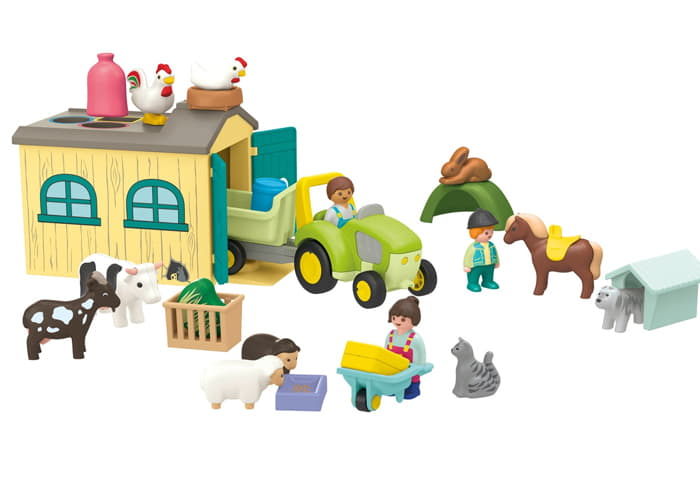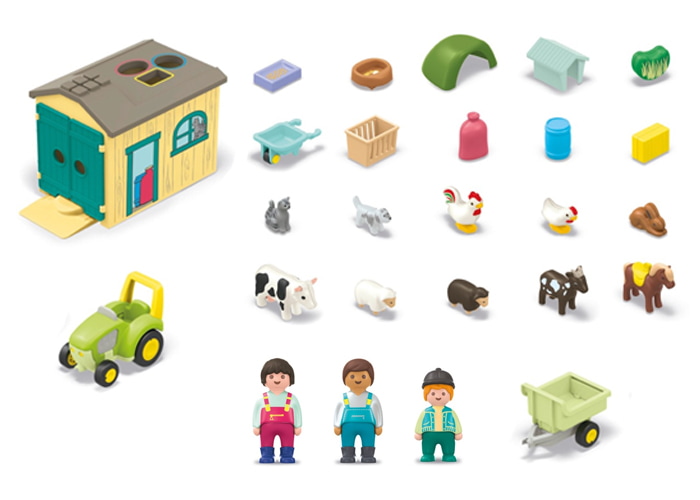 ¡Bienvenido/a a la granja! Con este set, niños y niñas podrán explorar la vida en el campo y cuidar de los animales en la granja. La familia de la granja está muy ocupada, ya que tienen que cuidar de los animales. El tractor con remolque está listo para recoger todo lo necesario del granero. Cuando el tractor entra marcha atrás en el granero con el remolque delante, puede empezar la carga. ¿Quién puede ordenar las pacas de heno, el barril y el saco de pienso en las ranuras correctas?