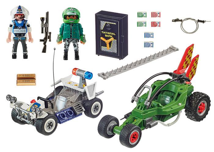 El juego contiene dos figuras de PLAYMOBIL, dos karts con motor de retroceso, una caja fuerte, una cinta de clavos, billetes y muchos otros extras.