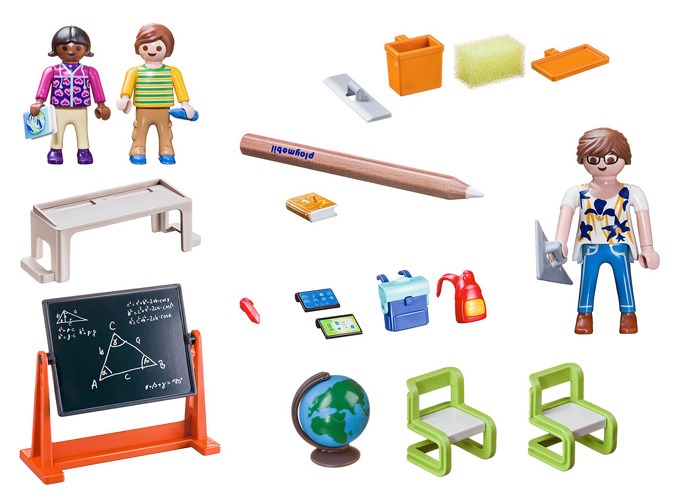 Incluye diferentes complementos del aula de colegio, como pizarra, pupitre, globo terráqueo...