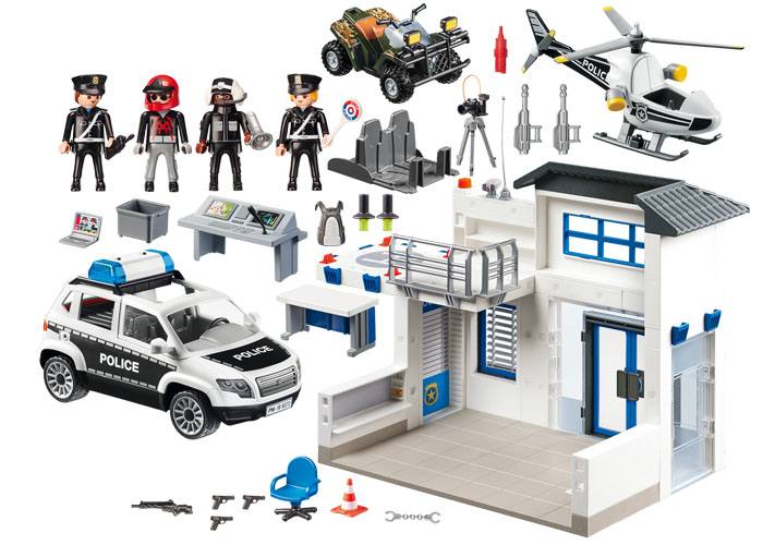 Playmobil Mega Set Policías. Uno de los set más completos de la seríe Policías, en el que se incluye comisaría, coche, helicoptero, quad con ladrón, así como cuatro figuras y muchos complementos.