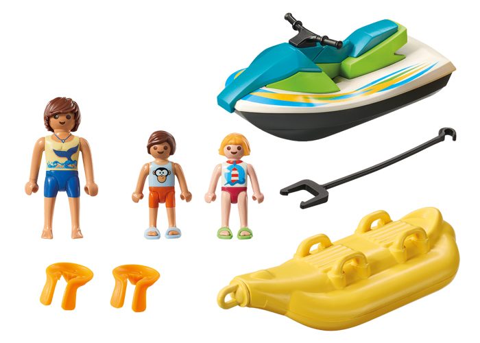 Los Playmobil disfrutan de unas auténticas vacaciones playeras en su moto de agua con flotador en forma de banana, ¡Se lo pasan en grande!