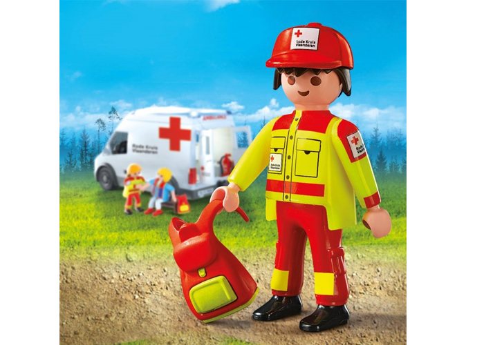 Representa a un voluntario de la Rode Kruis Vlaanderen, la Cruz Roja de Flandes (Bélgica). Junto al logo de esta organización, en el frontal de la caja, aparece también su lema "helpt helpen", que se podría traducir como "ayudando a ayudar".