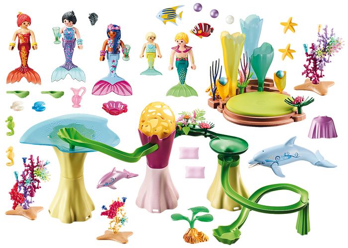 En el pabellón de coral, las sirenas están como en casa. La cúpula de luz (3 pilas de 1.5 V V necesarias) brilla tan pronto como una perla lo atraviesa. Con tren de perlas y abalorios para coleccionar. Incluye Amigos marinos y muchos otros accesorios. Se puede combinar con el salón de belleza Art. 70096 con ataúd de perlas.