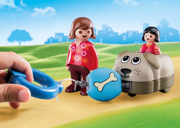 Salga a caminar tirando del trenecito del perro. Lleva al perro con una correa o deja que el personaje tire del perro. Alimente al perro con el hueso o pídale que le traiga la zapatilla. Ampliable con tren de animales de la referencia 70405.