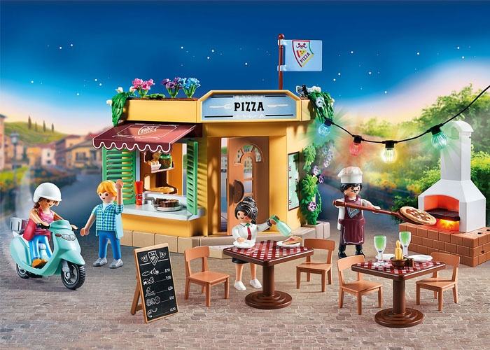 La cadena de pizzería Italiana abre su terraza brillantemente iluminada y el horno de piedra proporcionan un ambiente cálido e ideal para tomar la cena. (requiere pilas 3 x 1.5V ) Dimensiones: 25 x 19.5 x 15.5 cm