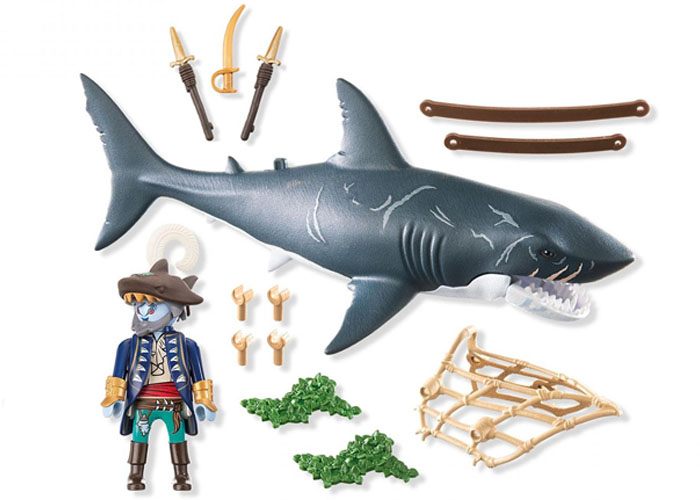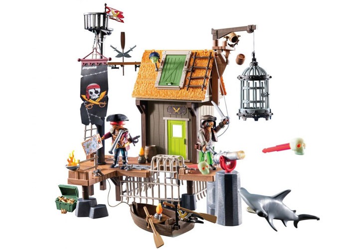 El gran puerto pirata PLAYMOBIL no sólo sirve como estación de atraque para los orgullosos barcos piratas, ¡sino también como una temible prisión! En la gran jaula situada bajo la caseta de vigilancia, a la que también se puede acceder a través de una trampilla, se puede detener a peligrosos tiburones o a piratas rivales. En el puesto de vigía suena inmediatamente una alarma en caso de peligro: el cañón de calavera y el gran barril giratorio, desde el que se pueden lanzar barriles más pequeños a los atacantes, defienden el puerto de los intrusos.