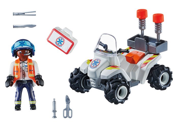 Acude a la escena con el rápido speed quad de rescate con motor de fricción, un médico PLAYMOBIL y fantásticos accesorios. Acaba de entrar una llamada de emergencia y el médico salta al quad y se dirige al lugar de los hechos. Gracias al motor de fricción del quad, el médico llega en un abrir y cerrar de ojos y está listo para ayudar a los heridos.