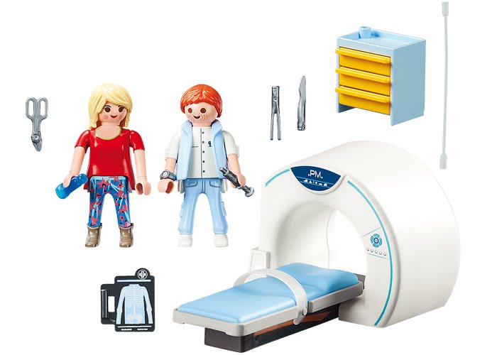 Usando la máquina de resonancia magnética, el radiólogo examina los órganos internos de sus pacientes. El paciente se acuesta en el sofá y se introduce en la cabina. Si necesita ayuda durante el examen, puede llamar al médico con solo presionar un botón. Todo va más rápido de lo esperado y ella es expulsada nuevamente. "¡Todo en perfecto orden!", Se regocija con su paciente. El juego contiene dos figuras PLAYMOBIL®, un dispositivo de resonancia magnética con una tumbona y correas para arreglarlo y otros extras.