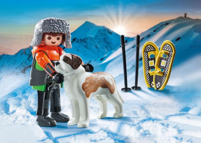 El excursionista está en la nieve con su San Bernardo. Experimenta el mundo de nuestros fieles amigos de cuatro patas y descubre a tus perros favoritos.