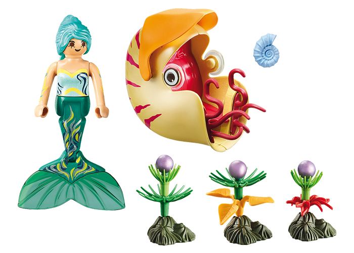 La sirena recolecta las perlas con el caracol molesto y las lleva a casa al pabellón de coral.