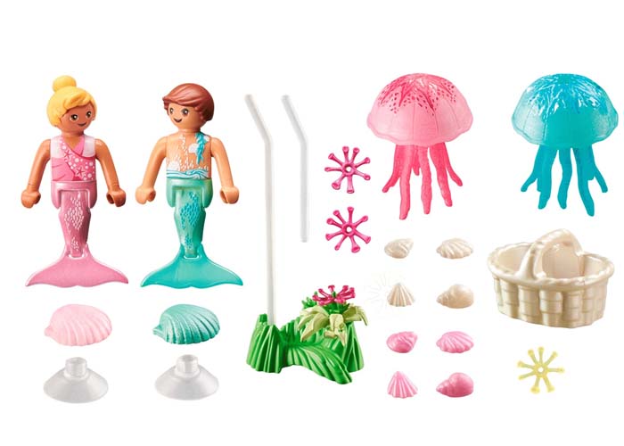 En el mundo de las sirenas se recolectan flores y conchas mientras se observan a las medusas. Contienen dos conchas con ventosa para decorar superficies lisas.