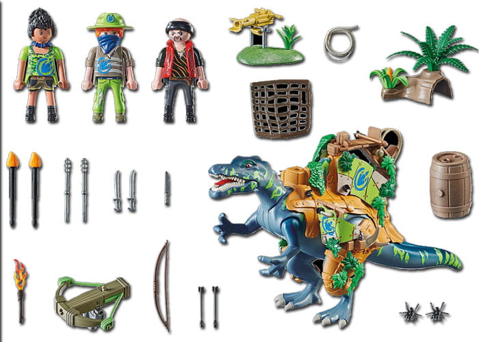 Ayla y Samu aumentan su potencia defensiva con Saichania. La armadura del Spinosaurus es acoplablbe, dispone de un gran cañón giratorio, red para proyectiles y lanza barril de madera y más accesorios.