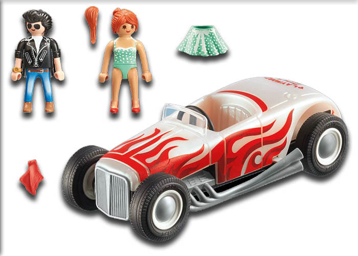 ¡Sube y ponte en marcha con el genial Starter Pack Hot Rod de PLAYMOBIL! El conductor coge el volante de su elegante bólido con un impresionante diseño de llamas. ¿Su chica ya le está esperando? Los Starter Packs de PLAYMOBIL son la introducción ideal al gran mundo PLAYMOBIL. Juega con este set combínalo con otros sets PLAYMOBIL. Incluye dos figuras PLAYMOBIL, un coche y un pañuelo. Hay espacio para una figura en el vehículo. La falda de dos piezas se puede quitar de la figura femenina.