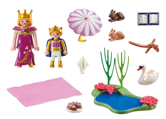 ¡La introducción perfecta a los mundos de los juegos de PLAYMOBIL! La reina disfruta del delicioso pastel con su hijo el príncipe en el lago.