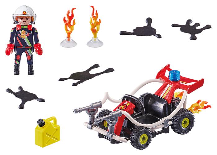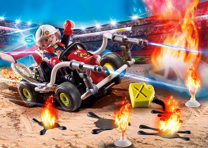 Las llamas a menudo se reavivan durante un stunt show. Sin embargo, si se vuelve muy peligroso, el Stuntshow Kart Bombero está preparado para actuar.