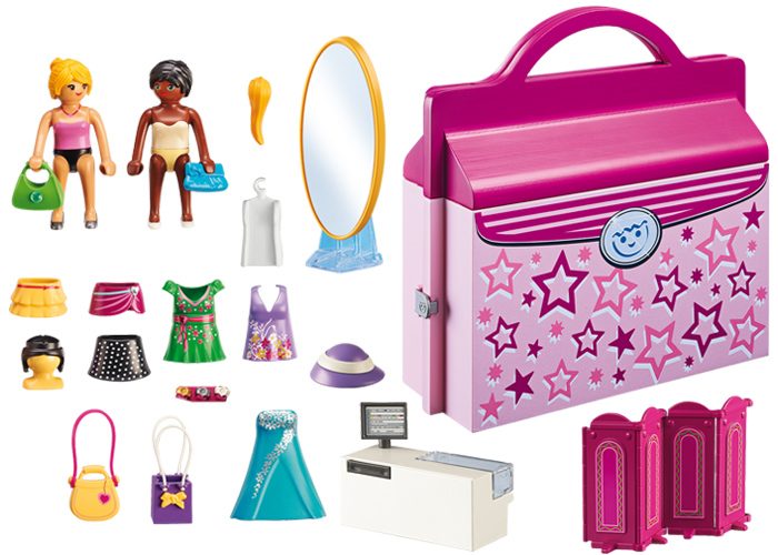 Preciosos vestidos, faldas, tops... todo tipo de ropa podrás encontrar en la tienda de moda de Playmobil. Además podrás jugar con él y guardarlo todo en el interior, ya que al cerrarlo es un maletín portátil.