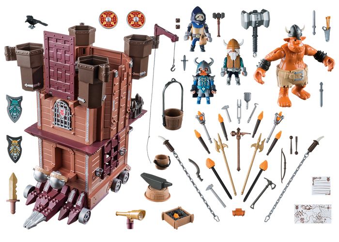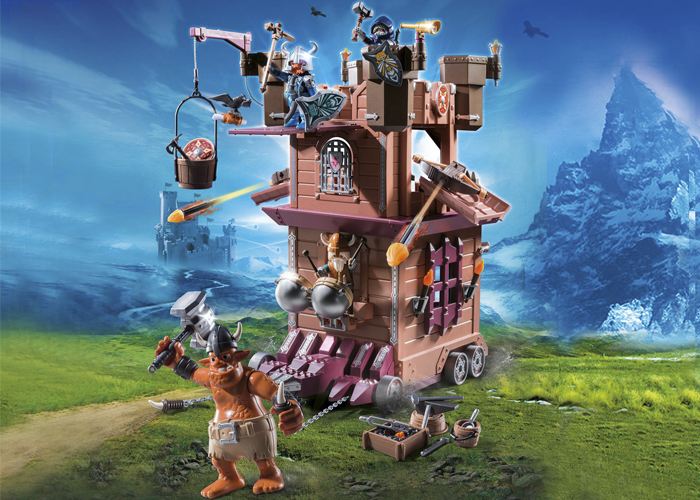 Al ritmo de los tambores, el troll gigante tira de la torre de asalto enana equipada con arietes, disparos de ballesta y prisión.