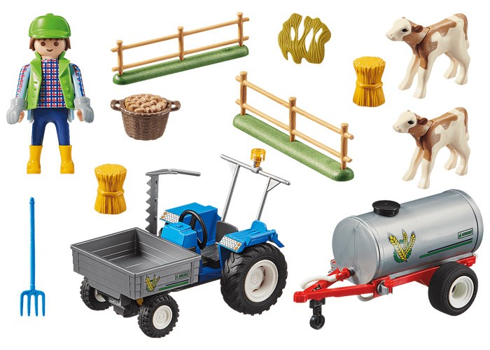 Incluye: una Figura de hombre, 2 terneros, 1 tractor de carga, 1 remolque con tanque de agua, 2 elementos de valla, 1 canasta de alimentación, 2 fardos de paja, 1 pajita, 1 rastrillo, 1 gorra de visera, 1 par de guantes.